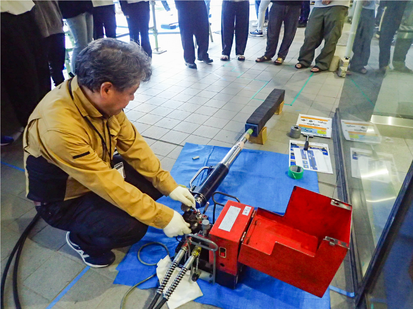4.橋梁模型、実物のPC鋼材及びPC板、緊張ジャッキなどを用いた体験学習