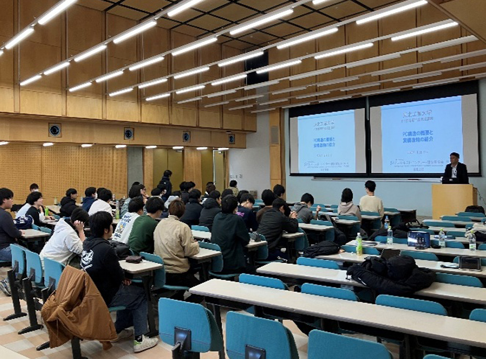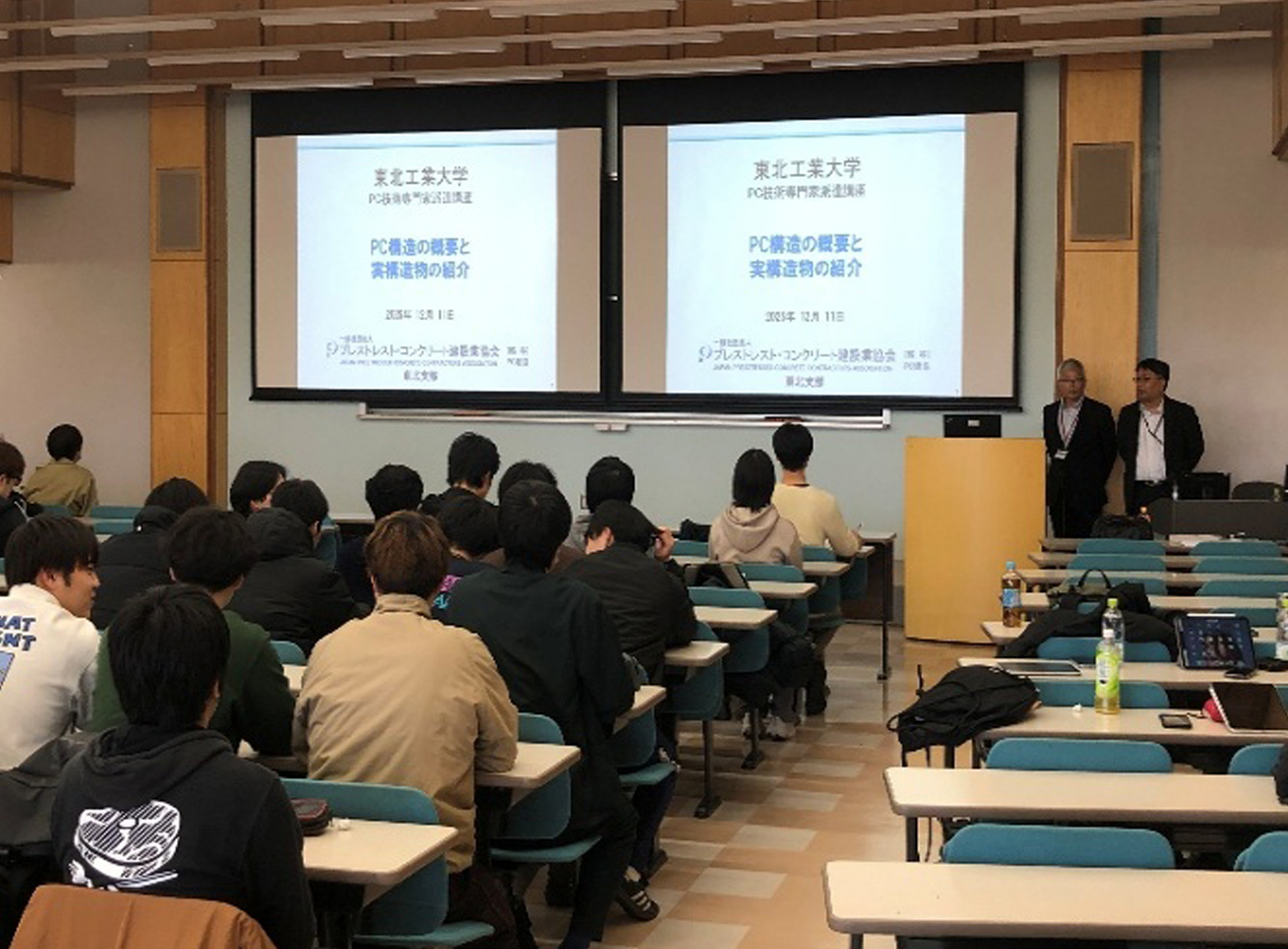 開催テーマ PC構造の概要と実構造物の紹介 開催日時 令和7年12月11日 13:10~14:50 会場名 東北工業大学八木山キャンパス9号館937室 参加人数 2年生 43名 概要 PC構造の概要
