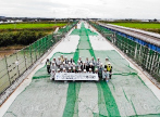 会場名 道道恵庭栗山線馬追橋架替工事(上部工)、日本高圧コンクリート(株)栗山工場 所在地 北海道長沼町、栗山町 施工会社 日本高圧・ドーピー特定建設工事共同企業体 概要 7径間連結PCコンポ桁(セグメント)、橋長L=311.1m、幅員W=11.0m、架設桁架設工法
